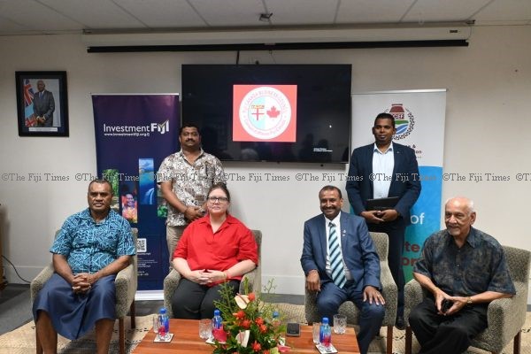 Investment Fiji CEO Kamal Chetty (standing, right) and Fijian Association of Canada president Sam Basra (right – sitting) with invited guests at the announcement of the soon-to-be launched Fiji Canada Business Council in Suva. Picture: JOSEFA SIGAVOLAVOLA